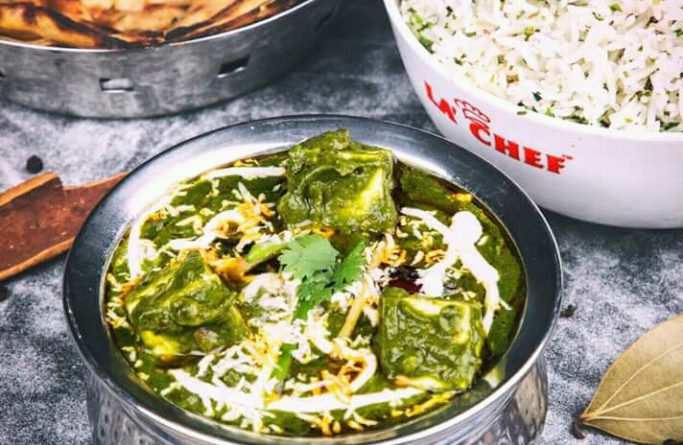 Palak paneer is a vegetarian dish originating from the Indian subcontinent, consisting of paneer in a thick paste made from puréed spinach and seasoned with ginger, garlic, garam masala, and other spices.